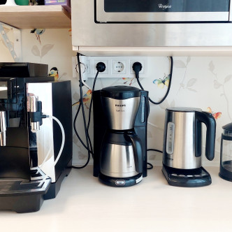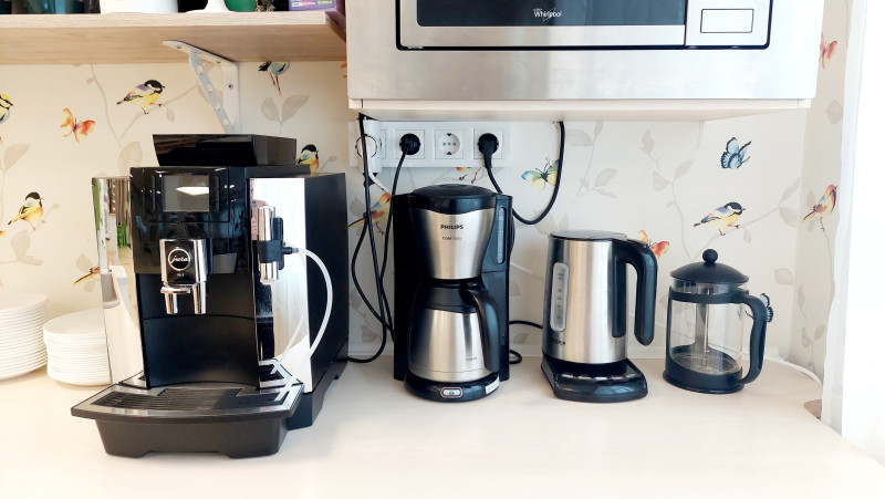 На месте имеются также френч-пресс, кофеварка с фильтром, чайник с горячей водой (фильтры и сахар имеются на месте).